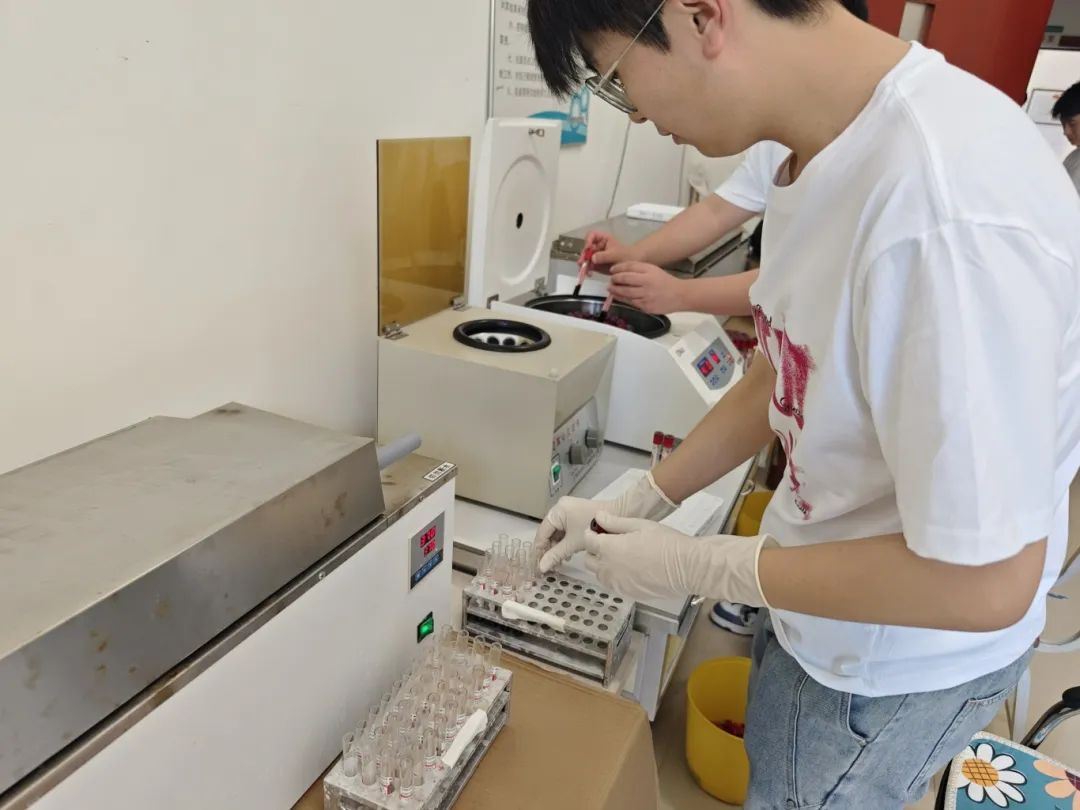志愿者帮助进行血液离心工作