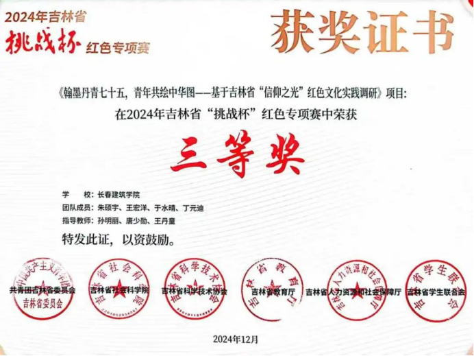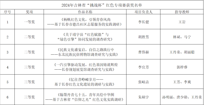 近日,由共青团吉林省委员会、吉林省社会科学院、吉林省科学技术协会、吉林省教育厅、吉林省人力资源和社会保障厅、吉林省学生联合会联合开展的2024年吉林省“挑战杯”红色专项赛评选结果公布,学校共6项作品获奖,其中:一等奖1项,二等奖2项,三等奖3项。