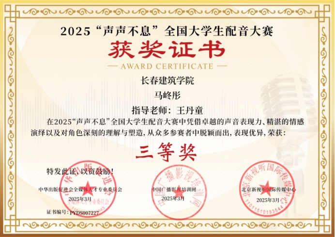 近日,由中华出版促进会全媒体人才专业委员会、中国广播影视培训网、北京新视听国际传媒中心联合举办的2025“声声不息”全国大学生配音大赛落下帷幕。在这场充满创意与激情的声音盛宴中,长建学子凭借生动还原经典,巧妙融入创新,在此次赛事中取得优异成绩,其中:一等奖1项,二等奖1项,三等奖4项,优秀奖4项。