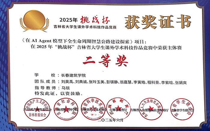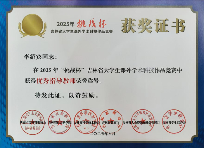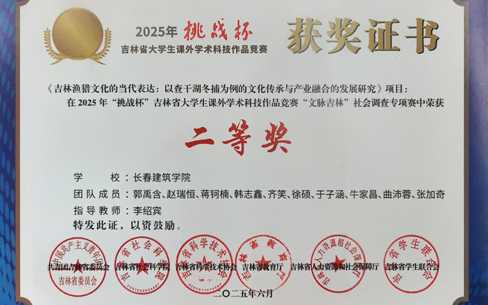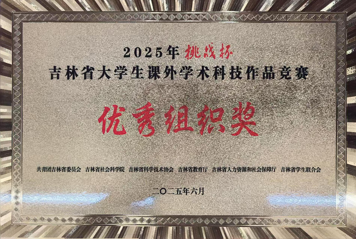 由共青团吉林省委员会、吉林省社会科学院、吉林省科学技术协会、吉林省教育厅、吉林省人力资源和社会保障厅、吉林省学生联合会联合开展的“2025年‘挑战杯’吉林省大学生课外学术科技作品竞赛”评选结果公布,学校15项作品获奖。其中,在2025年“挑战杯”吉林省大学生课外学术科技作品竞赛(主赛道)中获二等奖2项、三等奖8项;在2025年“挑战杯”吉林省大学生课外学术科技作品竞赛(文脉吉林专项赛道)中获二等奖1项、三等奖4项;学校荣获“优秀组织奖”;建筑与规划学院李绍宾老师荣获“优秀指导教师”荣誉称号。