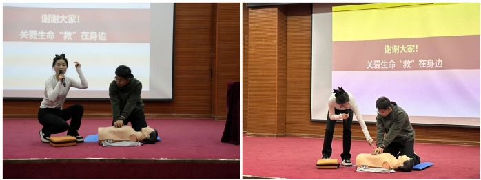 培训中,主讲人姜也老师以“心肺复苏及紧急情况医疗救护”为主题,结合真实临床案例进行了系统讲解。她深入浅出地阐述了心搏骤停“黄金四分钟”的急救理念,详细讲解了如何快速识别突发状况,并逐步演示了从环境评估、意识判断到胸外按压、人工呼吸的完整心肺复苏流程,对操作要点、按压深度和频率等关键细节作了重点剖析。此外,姜老师还拓展介绍了海姆立克急救法等实用技能,覆盖了多种常见突发场景。