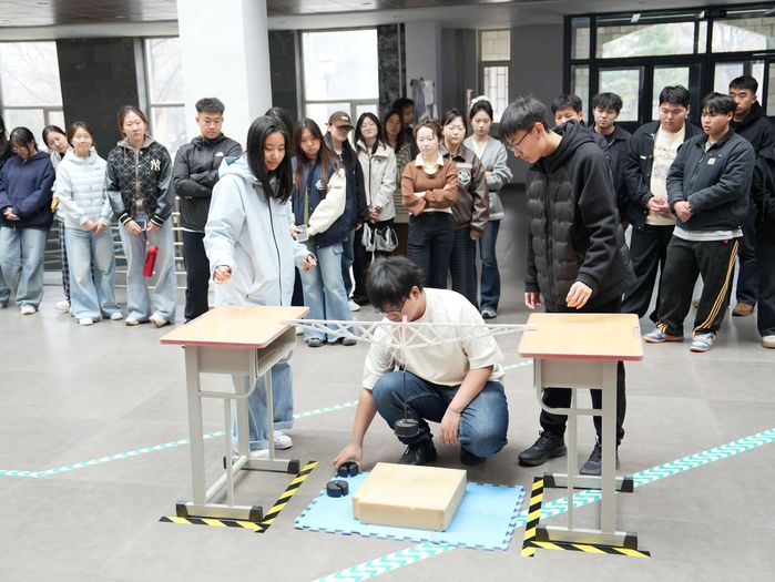 本届校赛以“单跨梁式结构模型设计与制作”为题,涵盖方案设计、模型制作、尺寸检测、自重测定与现场加载等完整环节。在紧张的加载现场,各参赛队沉着操作,逐级施加载荷,精巧的结构模型凝聚了学生对力学原理的深入理解与对细节的极致追求,充分体现了扎实的理论功底、创新意识与实践能力。